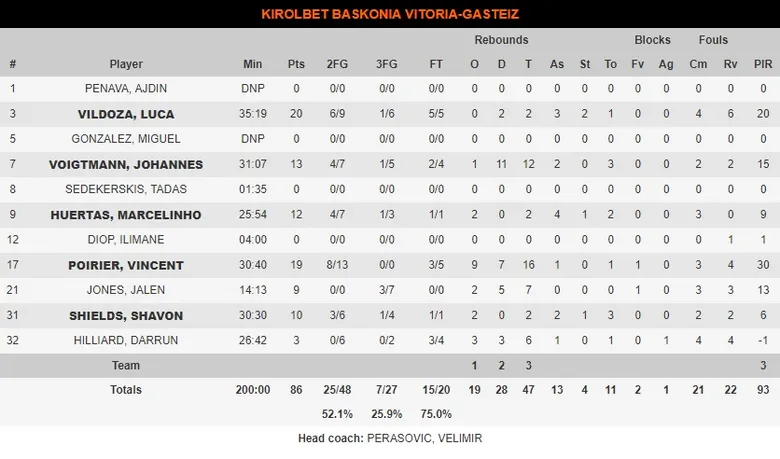 Pero el pívot francés de Kirolbet Baskonia no quiso perder el partido. Rozando el 20+20 (19 puntos y 16 rebotes), Vincent Poirier da un golpe sobre la mesa, y sentenció el duelo junto al argentino Luca Vildoza, quien asumió el balón cuando más quemaba. El carácter del base junto a la garra del pívot sentenciaron un partido, avisando del posible duelo que puede darse en la siguiente fase, en caso de que se clasifiquen en sexta posición. Victoria de carácter e intensidad de Kirolbet Baskonia (86-76).