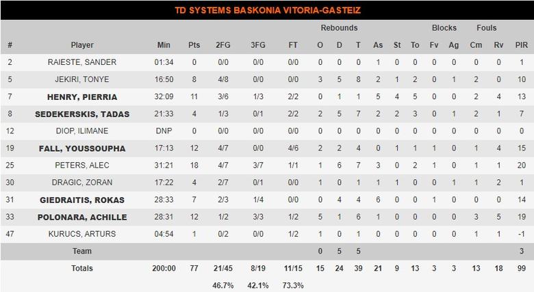 TD Systems Baskonia afrontaba este partido con la baja de Luca Vildoza y Anadolu Efes de Tibor Pleiss. Solo eran dos bajas por bando pero las dos tremendamente importantes, ya que el alemán está siendo el sustento interior de los de Ataman ante los problemas físicos sufridos por Dunston esta temporada, y los de Ivanovic basan gran parte de su juego en la combinación de sus dos bases estrella. Sanli salía de titular por los turcos mientras que Pierria Henry sabía que hoy sería otro de esos partidos en los que superaría la treintena en minutos. Hay que decir que en el apartado físico la situación era peor para Anadolu, con el mencionado Dunston, Vasilije Micic y Beaubois sin estar con ritmo tras los percances que provocaron que se perdieran varios partidos, lo que motivaba que el partido de hoy era una buena ocasión para que Baskonia se metiera en puestos de playoff.