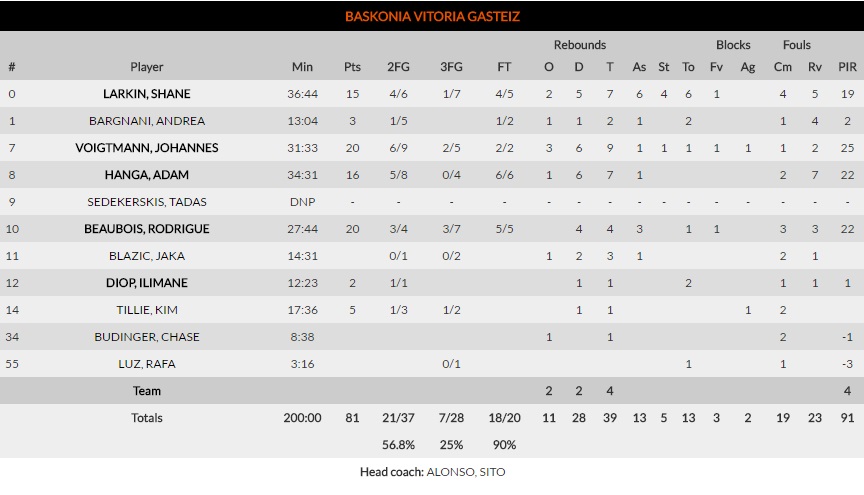 Y todo ello a pesar de la tensión vivida anteriormente en dos situaciones concretas: con algo más de dos minutos jugados del último período, Heckman colocaba al Brose Basket 10 arriba (complicando una situación que a los baskonistas les costaba tener de cara); y tras el parcial más importante (en el que se pasó de un 61-70 a un 70-70), se daba una situación de técnica a Larkin por golpear un balón, dando 3 puntos de ventaja y posesión al rival. Pero esto no paró al trío Larkin-Voigtmann-Beaubois, que con sus acciones puso por delante a su equipo y logró adquirir una mínima ventaja antes del minuto final.
