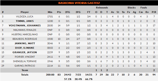Fundamental Garino. Cuando más feo se puso el partido, un 2+1 del argentino permitió al Baskonia cortar un abultado parcial visitante y otros dos mates consecutivos nada más empezar el último cuarto pusieron en pie a la afición. Garino marcó el camino hacia el playoff y sus compañeros se vieron contagiados de ese carácter para redondear una noche mágica que permite a los alaveses estar entre los 8 mejores equipos de Europa.