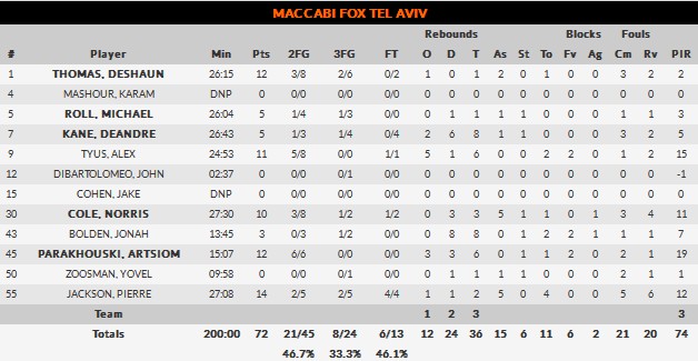 En un intenso e igualado arranque de partido, con ambos equipos conscientes de lo que se jugaban, la entrada en pista de Vincent Poirier dio otro aire al Baskonia para cerrar el primer cuarto con una ligera ventaja (22-18). Los locales estiraron la renta hasta los diez puntos liderados en ataque por Johannes Voigtmann y Neven Spahija se vio obligado a parar el partido, pero el talento de jugadores como Pierre Jackson y DeShaun Thomas volvió a meter en el partido al Maccabi antes de llegar al descanso (38-34).