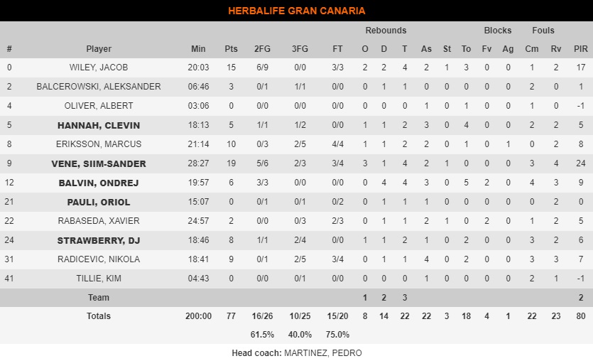 Derrick Williams y Stefan Jovic, dominadores del partido. El ritmo del partido lo marcaron ambos jugadores, quienes pasaron por encima física y tácticamente a un Herbalife Gran Canaria muy blando en defensa. Con 20 puntos y 6 rebotes del americano, junto a los 8 puntos, 8 asistencias y 2 robos de Jovic, marcaron el ritmo del partido, siendo el pilar en el que se cimentó la victoria.