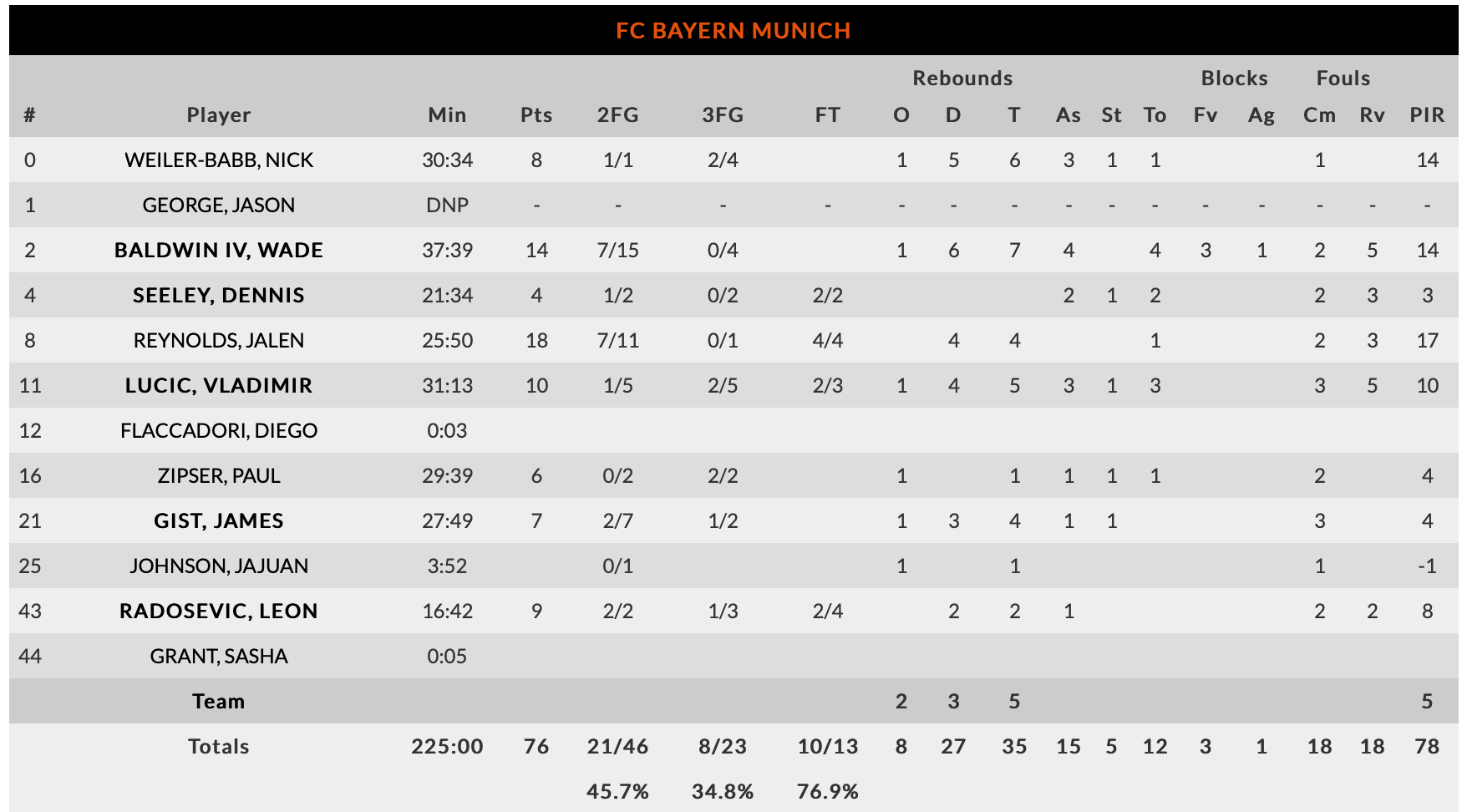 Tuvieron opciones de ganar el encuentro. Es más, lo tenían de cara tras haber remado y remado hasta llegar al final del partido empatados a 72 y con la última posesión. Pero entonces, Wade Baldwin VI cometió un fallo que, a la postre, dio alas al Real Madrid para encarar la prórroga con más motivación si cabía: el americano superó a Taylor y, cuando todos creían que iba a lanzar, siguió hacia adentro y se acabó quedando sin ideas hasta que perdió el balón. En esa jugada, precisamente, no estuvo el jugador más valorado del Bayern, Vladimir Lucic, a quien el propio Taylor, Abalde y compañía se encargaron de anular: 10 puntos con 1/5 en tiros de 2 y 10 de valoración -gracias, en parte, a las 5 faltas recibidas-.