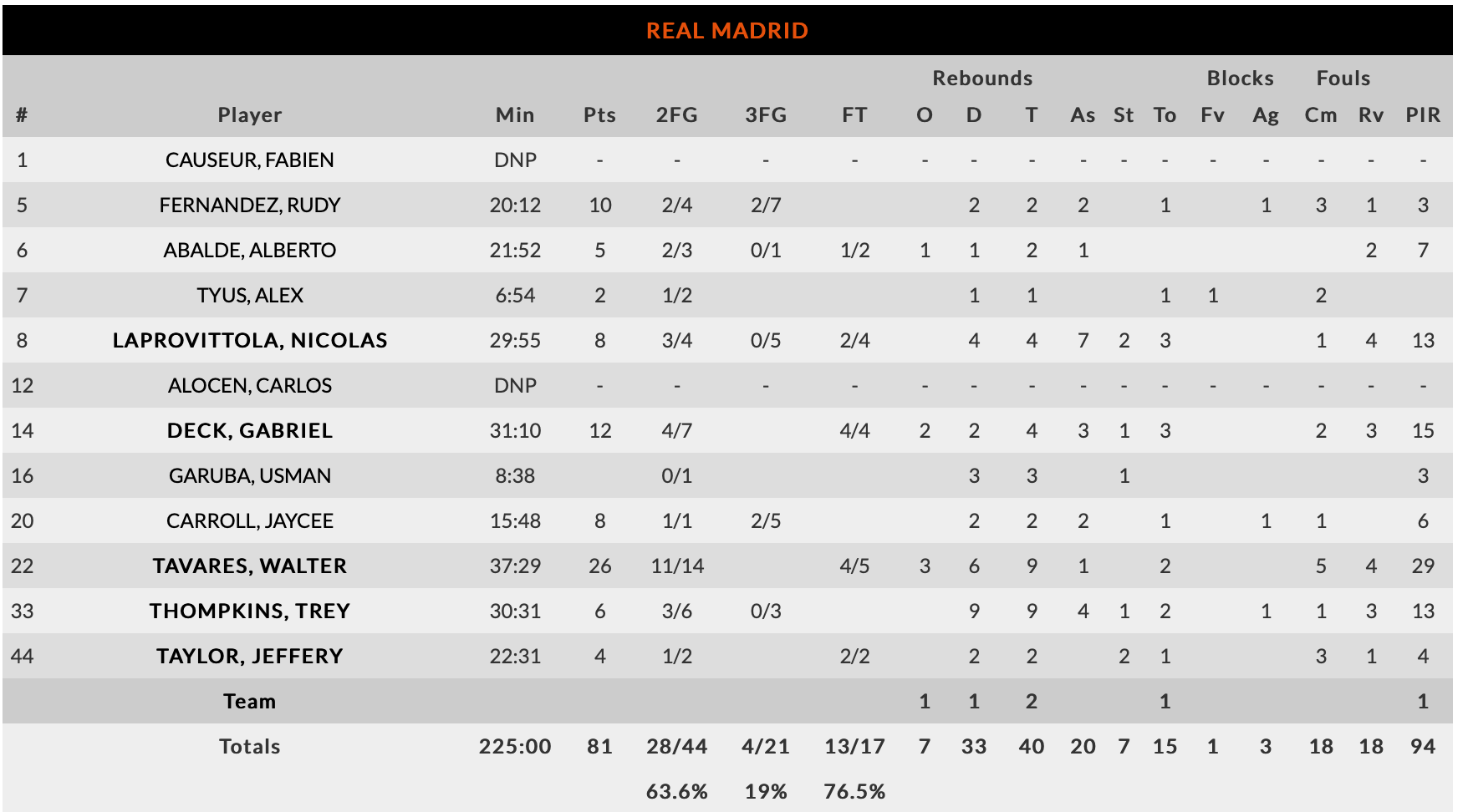 El Real Madrid arrancó el encuentro con 8 asistencias en el primer periodo, con Deck y Laprovittola como protagonistas en el reparto del juego y con Tavares como ejecutor. Después el equipo local anuló a los de Laso, que vieron cómo poco a poco iban frustrando las opciones de irse en el marcador. Sin embargo, el sentido de juego coral se mantuvo presente y acabaron con 20 pases de canasta. En el tiempo extra, el juego ofensivo no se basó tanto en la movilidad del balón ni en la búsqueda de triples para sentenciar, sino que se basó en las individualidades -y, más concretamente, en Larpovittola-.
