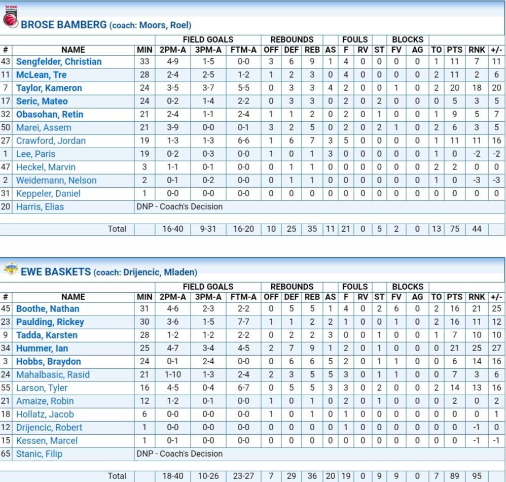 La ventaja para los de la Baja Sajonia se estableció en torno a los catorce puntos. Bamberg tuvo la última ocasión de reengancharse, tras un triple de McLean y una canasta del egipcio Marei más falta personal que no pudo aprovechar.