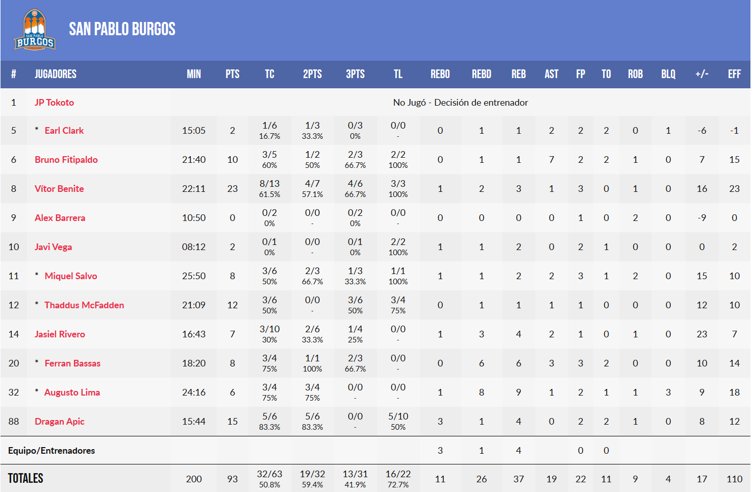 Vitor Benite, mandar desde el triple: Impresionante partido del brasileño con 23 puntos y 4/6 desde el triple, comandando a los tiradores de San Pablo Burgos que anotaron el 42% de sus lanzamientos. En la primera mitad estuvieron aún mejor y Benite supo cortar cualquier intento de remontada de los griegos.