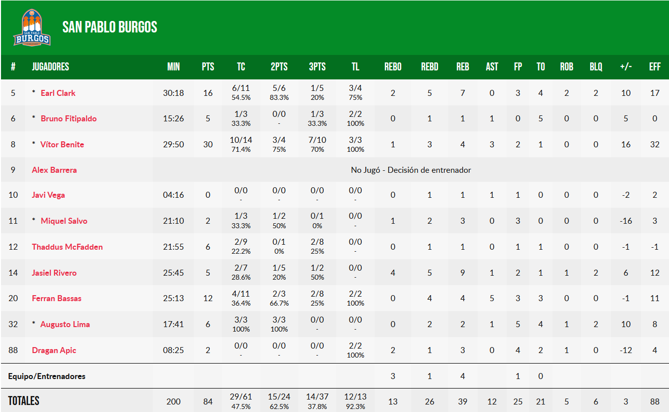 Vitor Benite y Earl Clark: Como en todos los partidos grandes, ambos fueron los baluartes de San Pablo Burgos. El brasileño anotó sin piedad durante toda la primera mitad, mientras el americano tomó las riendas en la segunda, tanto en ataque como en defensa. 30 puntos para el escolta y 16 puntos y 7 rebotes para el interior. La pareja clave de los burgaleses.