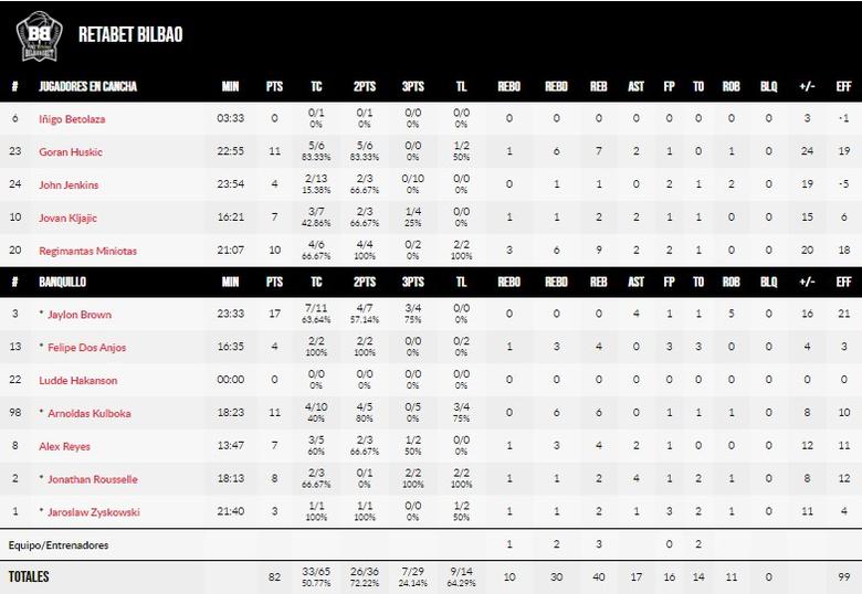 Reyes, Miniotas y Huskic lideran un banquillo protagonista. Hoy fue uno de esos días en los que cuesta encontrar un único MVP al destacar muchos jugadores a parecido nivel. Tanto Rousselle como especialmente Jaylon Brown podrían haber sido los elegidos, Kulboka también tuvo muy buenos momentos anotadores a pesar de no estar acertado en su especialidad, pero quienes comenzaron a poner las primeras ventajas en el marcador y brillaron por encima del resto fueron los hombres que salieron desde el banquillo. Entre el alero fichado de la LEB Oro y la pareja interior firmada con la temporada empezada, y que han aportado más desde el primer momento que los fallidos Jones y Kingsley, sumaron un total de 48 de valoración para RETAbet Bilbao Basket.