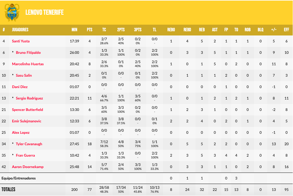 Dominio aurinegro en el primer cuarto: Los de Vidorreta, a partir de una buena defensa, han conseguido llevar la iniciativa en el marcador durante los primeros 10 minutos. Sergio Rodríguez, con dos triples consecutivos, abrió la primera mini brecha en el electrónico (9-13), acompañado de buenas acciones de Fran Guerra y Tyler Cavanaugh, para terminar el primer período con un 13-19 favorable a los tinerfeños.