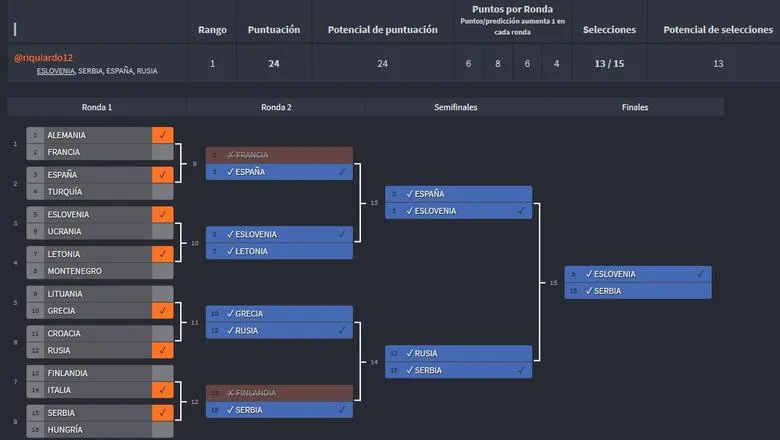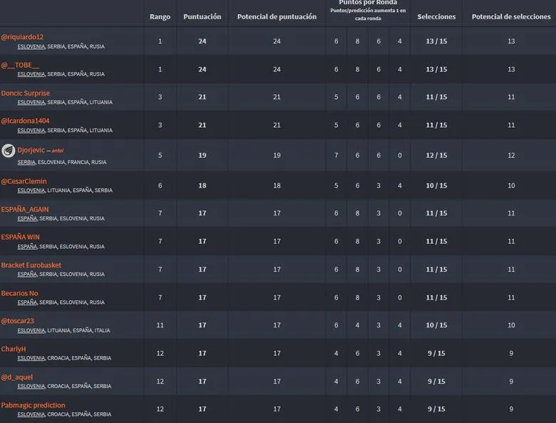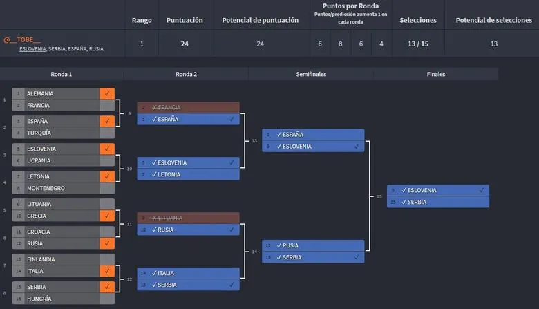 @riquiardo12 tan solo falló en dos eliminatorias de octavos (apostó por el triunfo de Francia ante Alemania y por el de Finlandia ante Italia). A partir de ahí su marcha en el juego fue perfecta. Similar fue la trayectoria de @__TOBE__, que solo erró en el Alemania-Francia y el Lituania-Grecia de octavos. A partir de ahí, ningún error más.