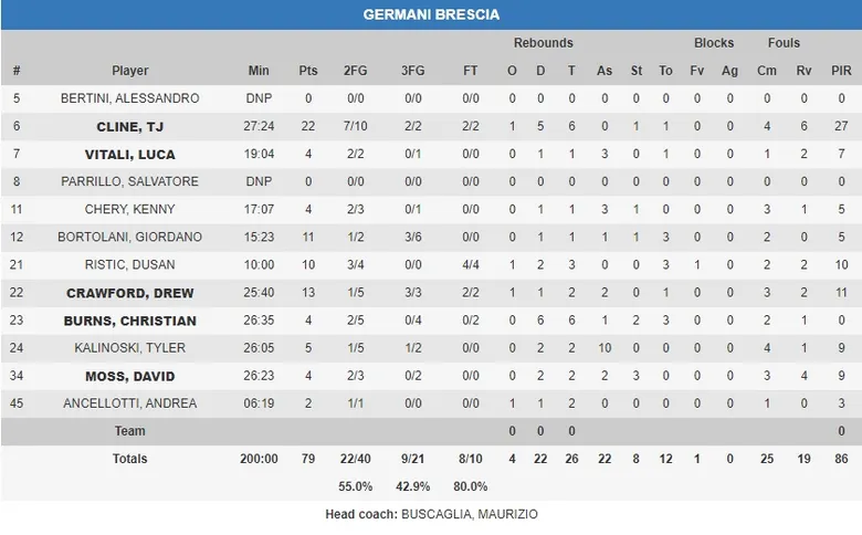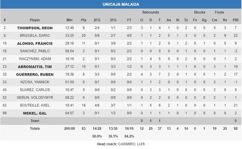 No podemos destacar solo a un jugador de Unicaja en el partido. Detacada actuación de Rubén Guerrero (8 puntos, 7 rebotes), que se adueñó de la pintura en algunos momentos del partido. Pero los jugadores que decantaron la balanza para que Unicaja sumara su séptima victoria en la competición fueron Darío Brizuela y Axel Bouteille. Ellos asumieron el protagonismo en el último cuarto, con triples y penetraciones, con jugadas de 2+1 que fueron determinantes en el resultado. Brizuela concluyó con 20 puntos, 5 asistencias y 9 faltas recibidas para 22 de valoración, asumiendo la dirección del equipo en la ausencia de su trío de bases. Bouteille acabó con 18 puntos, 6 rebotes y 2 asistencias para 21 de valoración en poco más de 18 minutos. En el equipo italiano, destacada actuación de TJ Cline, con 22 puntos y 27 de valoración.