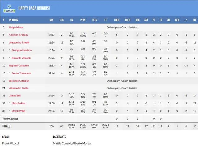Mala pinta para el escolta, que no volvió a pisar la cancha en todo el partido y cuyo rostro serio hace temer una lesión seria, que haría bajar mucho el potencial de Happy Casa Brindisi en la BCL y que, desde luego, dejó sin un referente ofensivo a la escuadra de Frank Vitucci.