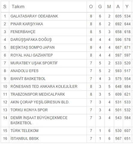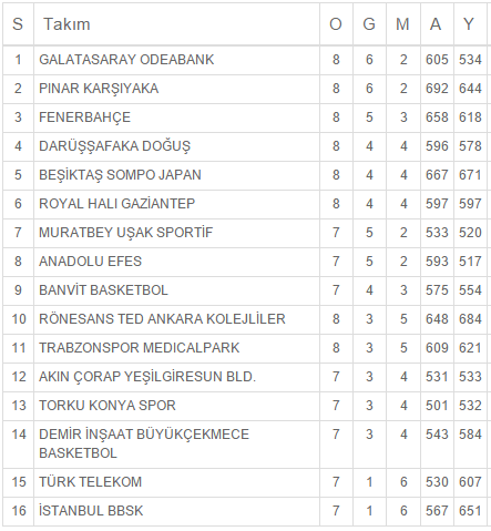 En lo alto de la clasificación, Galatasaray sigue pujante, con seis victorias y tan solo dos derrotas. En esta jornada los de Ataman superaron al Torku Konyaspor por 87-65 pese a los 35 puntos de Clay Tucker para los visitantes. El parcial inicial de 27-11 para los locales marcó el devenir de un partido en el que destacaron por Galatasaray Vladimir Micov (25 puntos) y Stephane Lasme (20 puntos y 11 rebotes). Los visitantes se recuperaron de ese primer golpe, devolviendo un parcial de 17-32 en el segundo periodo. Pero la gasolina se les acabó a los jugadores del Torku y Galatasaray volvió a poner tierra de por medio tras el descanso.