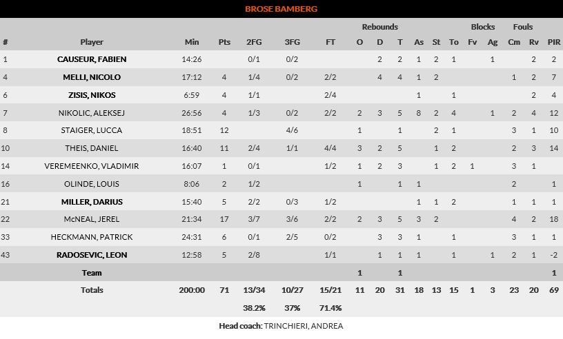 Los últimos diez minutos sobraron completamente. El equipo germano bajó, durante muchos minutos, los brazos, mostrando una gran desmotivación cada uno de los jugadores. Los baskonistas, por su parte, aprovechaban ese ánimo del rival y aumentaban la renta hasta a diferencias que casi alcanzaron la treintena, dejando como anécdota la intensidad que hubo hasta el final. El resultado: 71-96.