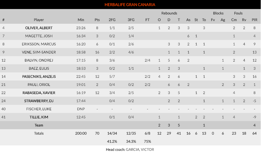 Tiros libres: El Granca no tiró ningún tiro libre en el primer tiempo, solo dos en el tercer cuarto y terminó el partido con ocho. Mientras, su rival tiró veintidós. Se le puede dar influencia a los árbitros, y/o a la forma de atacar del Herbalife. Volvieron a tener una gran concentración de tiros exteriores (35 intentos), pocos balones claros a sus pívots y muchos fallos en las penetraciones de los exteriores.