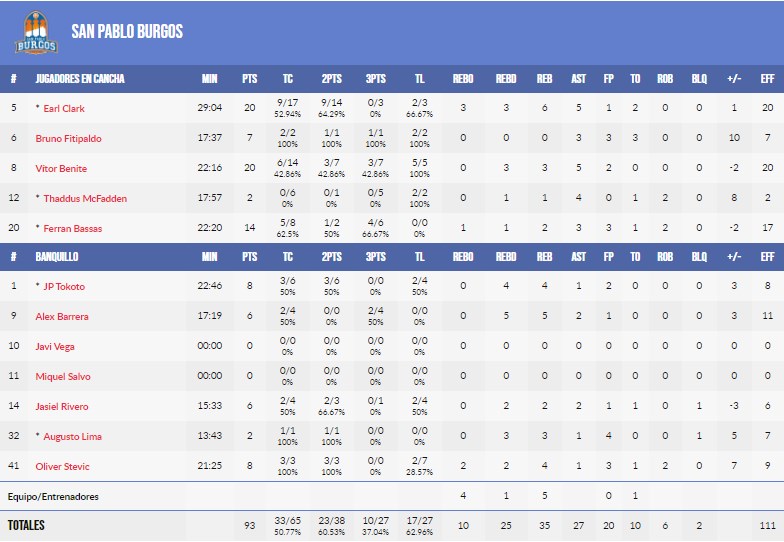 Asistiendo uno se divierte más. La primera parte en ataque de San Pablo Burgos fue casi perfecta y el principal motivo no fue la gran eficacia de Ferran Bassas con 14 puntos con un solo fallo en el tiro, sino la capacidad del equipo de encontrar al compañero. En el primer cuarto 11 de las 12 canastas anotadas fueron tras asistencia y al descanso eran 17 de las 20 para una espectacular estadística de 27 asistencias repartidas por 33 tiros anotados al final del partido.