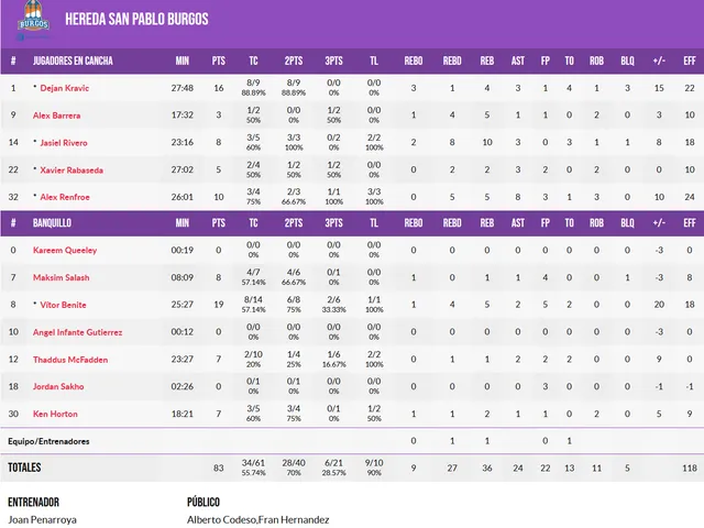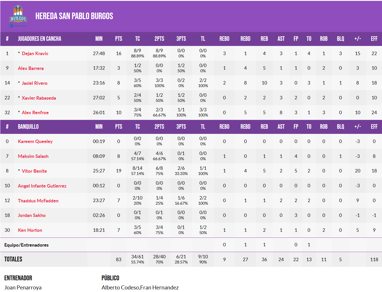 Además de sus puntos, Benite aportó 5 rebotes, la mayoría largos, saliendo rápido al contraataque y 2 asistencias. Pero el apartado estadístico que mejor habla de él es el diferencial +/-: +20 para Hereda San Pablo Burgos con Vítor en cancha. Vital para resolver partidos clave.