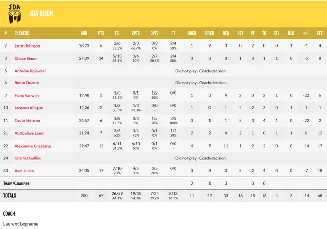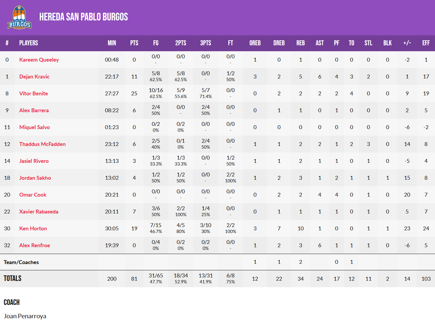 Se echaban en falta los puntos del capitán en el partido contra Hapoel de Jerusalem, pero Vítor Benite no faltó a su cita con el JDA Dijon. 25 puntos para el brasileño con 5/7 desde el perímetro y, sobre todo, esa clase de liderazgo indudable que hace que en cualquier jugada puedas poner el balón en sus manos. Especialmente en la primera parte, el escolta fue dominante, cortando hacia canasta, corriendo las transiciones y tirando con mucha confianza. El rey ha vuelto y Burgos sonríe. Cuando Benite muestra este nivel, rompe los partidos.