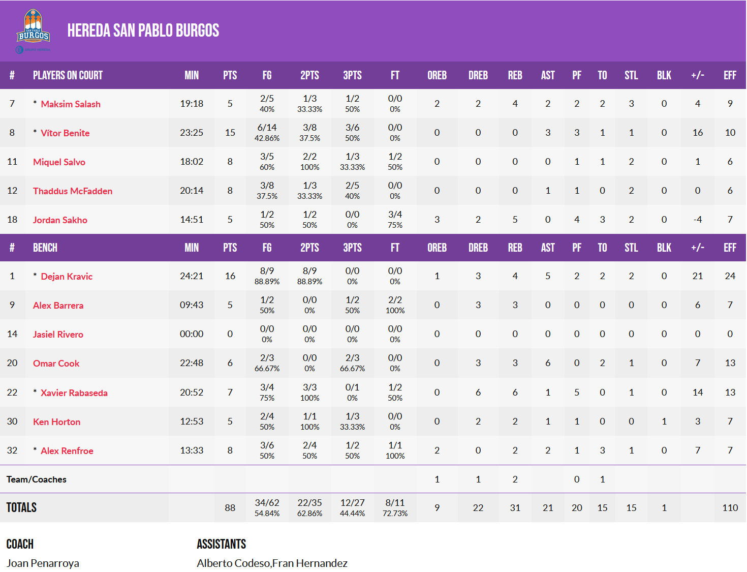 Especialmente notable fue el mal día de Olivier Troisfontaines, único jugador del encuentro que acabó negativo, ya que falló sus 4 lanzamientos desde el triple, se quedó en 2/4 en tiros de 2 y perdió 4 balones. La confusión reinó en el conjunto belga durante toda la segunda mitad, mientras los burgaleses lograron rehacerse y cerrar con autoridad el encuentro, con unos grandes minutos finales de Thad McFadden en defensa, leyendo las líneas de pase a la perfección.