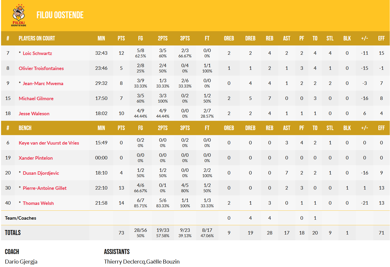 Solamente un jugador de Peñarroya pasaron de los 20 minutos en cancha: Dejan Kravic (14 en la primera mitad, 10 en la segunda), mientras Oostende veía bajar su rendimiento varios enteros cada vez que sus titulares tenían descanso.