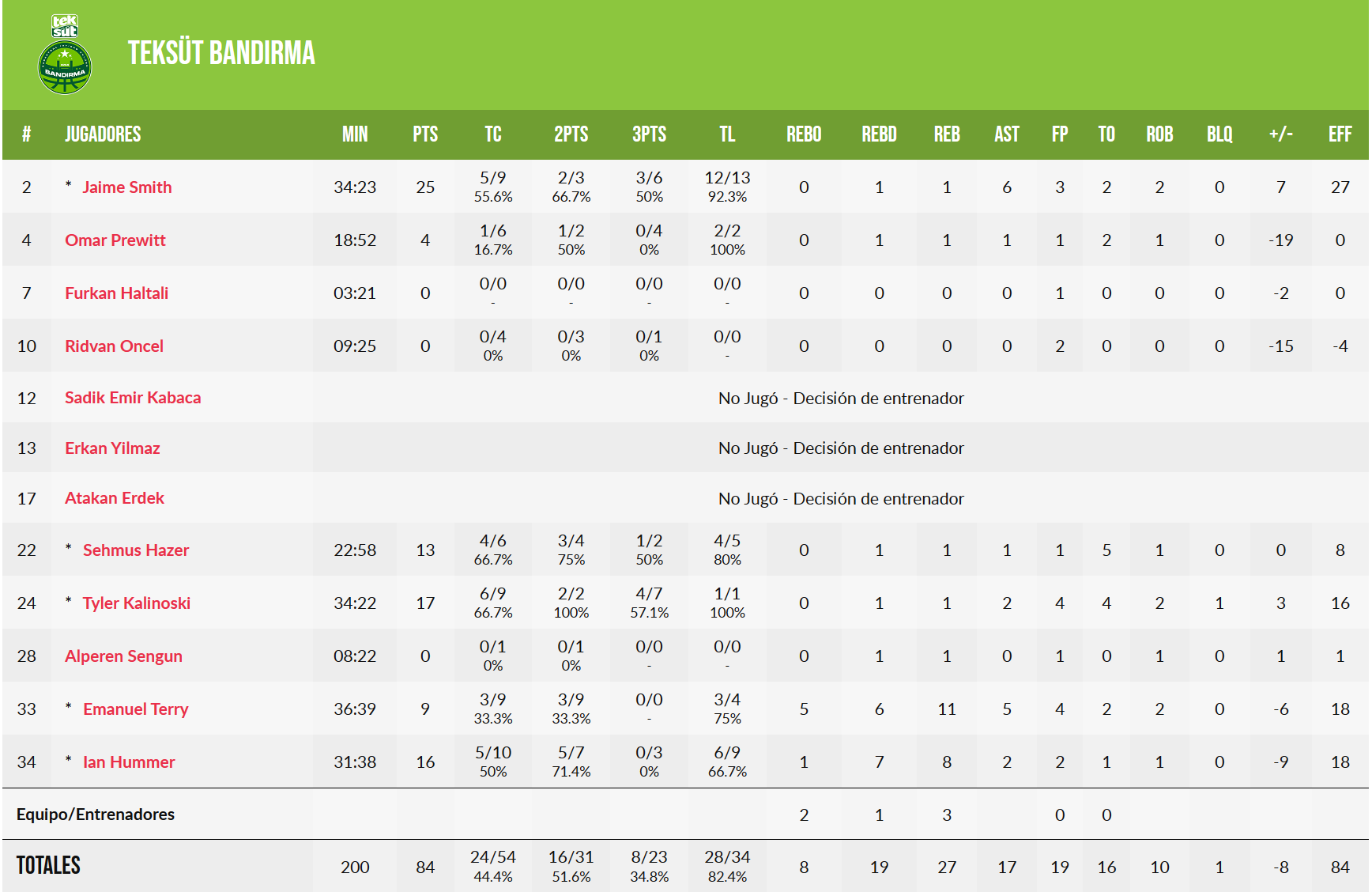 La anotación de Jaime Smith y Sehmus Hazer: Hazer lideró a los suyos durante la primera mitad, en la que Smith no apareció y los turcos quedaron sin referente ofensivo ante la baja producción en ataque de Terry. El joven turco se echó a los suyos a la espalda esperando a Smith, que acabó firmando un partidazo de 25 puntos y 6 asistencias para 27 de valoración y ser, de largo, el mejor sobre la cancha.