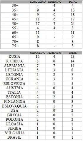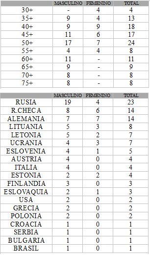 El gigante soviético es el país que presenta más equipos, tanto en la categoría masculina (19) como en el total de equipos (23). Sin embargo, en la categoría femenina sobresalen Alemania (7) y la anfitriona República Checa (6).