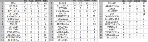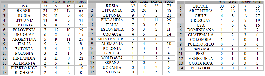 En lo que a Mundiales, se refiere Estados Unidos, Brasil, Rusia y Lituania son los grandes dominadores, teniendo en cuenta que los medalleros aglutinan las diferentes categorías y tanto los torneos masculinos como femeninos. Si nos quedamos en territorio europeo, tres países ex-soviéticos copan las primeras posiciones, seguidos por un sorprendente Finlandia, mientras que los torneos paramericanos están dominados por Brasil.