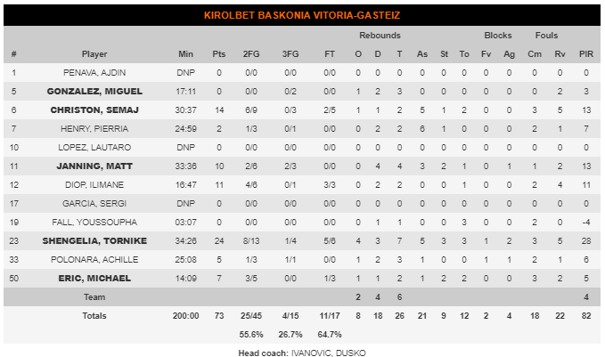 El fantasma de las lesiones, una vez más: Despertar con el píe izquierdo, que se te cruce un gato negro, pasar por debajo de una escalera… Baskonia no es que haya realizado alguna de estas, sino que este año las ha hecho todas a la vez. El banquillo de lesionados tenía esta noche más miembros que el banquillo de cancha. Algo paranormal, pero por desgracia cierto. A los ya habituales Vildoza, Granger, Garino… se les sumaban esta noche Zoran Dragic y Shavon Shields. Dos bajas muy sensibles de dos auténticos ‘guerrero de Dusko’. Dos hombres de máxima confianza del técnico montenegrino que verían desde la grada el partido, dejando las posiciones exteriores de Baskonia muy mermadas. Si a ello le sumamos que ni Henry, ni Miguel Gonzalez tuvieron su mejor noche nos queda como resultado que Baskonia fue únicamente liderado por Shengelia, una vez más, Semaj Christon y un decisivo Matt Janning en los instantes finales.