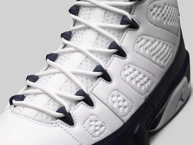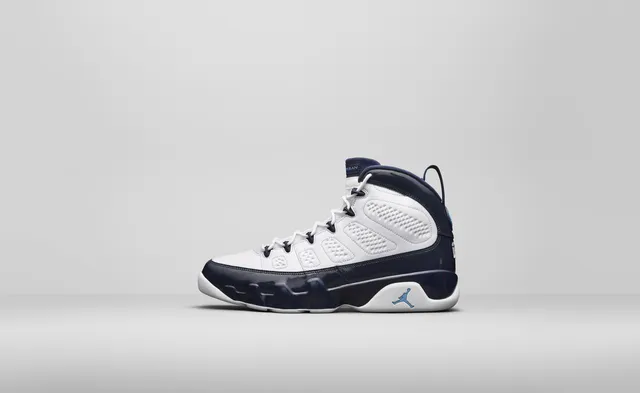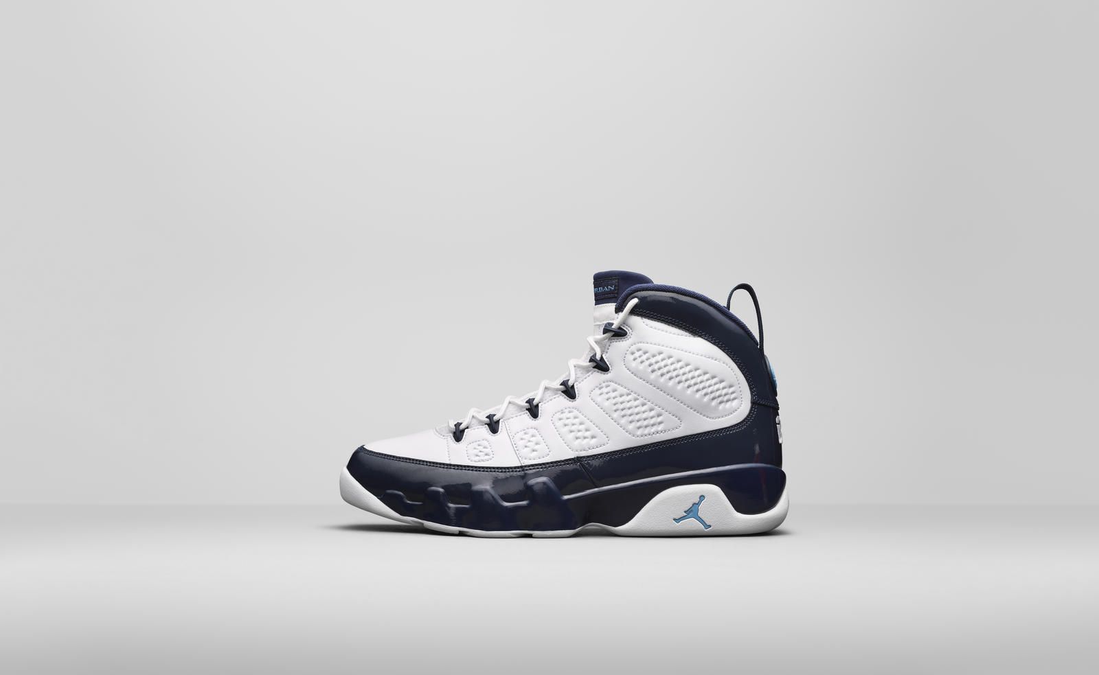 Las Air Jordan IX se engalanan con una bonita combinación de tonos blancos, azules y celestes que rinden tributo al equipode la universidad de North Carolina, donde Michael Jordan jugó durante su época universitaria.
