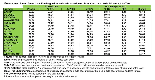 Comenzamos analizando las posesiones disputadas por cada jugador, y el uso y aprovechamiento de las mismas, así como diferentes medidas para evaluar los porcentajes de tiro (ampliar tabla).