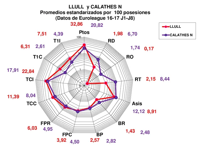 Por último mediante este gráfico comparamos a dos de los mejores bases de la competición, como son Llull y Calathes, el primero con un rol más anotador, y el segundo con un rol más de director puro.
