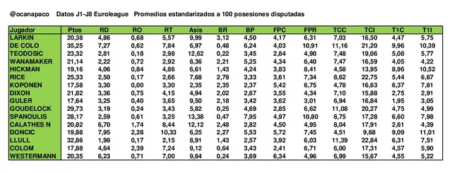 Analizamos ahora los rendimientos de cada jugador estandarizando los valores por cada 100 posesiones disputadas por el jugador, con objeto de hacer una comparativa más homogénea, puesto que la presencia de cada jugador en pista es variable (ampliar tabla). Tengáse en cuenta además, de cara a esta comparativa, que los equipos disputan diferente número de posesiones por partido (por ejemplo, Real Madrid juega de media 5 ataque más por partido que Olympiacos).