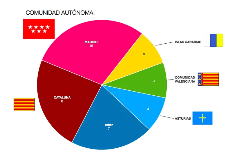 Si nos fijamos en la ciudad de nacimiento de nuestras chicas, Madrid y Cataluña son las Comunidades autónomas que más están representadas en la liga universitaria norteamericana, seguidas de la Comunidad Valenciana, Islas Canarias y el Principado de Asturias: