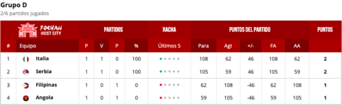 Italia y Serbia no pueden permitirse perder ningún partido. Parece que la lucha entre ambos conjuntos en la última jornada definirá la segunda y primera posición. Tanto Filipinas como Angola se ven claramente inferiores. De todas formas, es importante cada victoria para la siguiente fase y la clasificación al preolímpico.