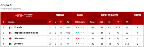 Un reflejo del grupo A. El partido del grupo es claramente el República Dominicana contra Francia. Todo puede pasar. Alemania tiene que sumar en su encuentro contra Jordania o su clasificación a las Olimpiadas puede ser casi imposible.