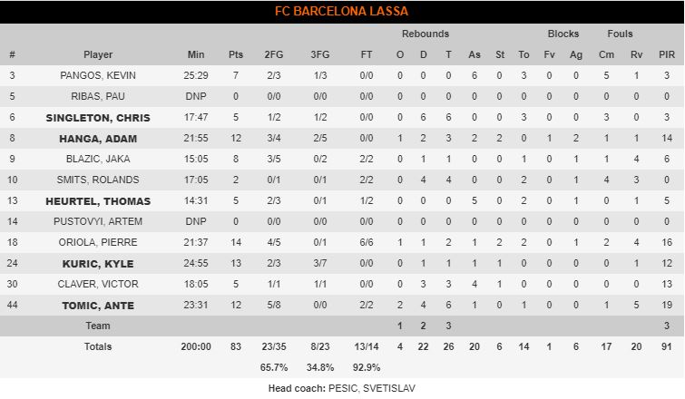 Sin embargo, como bien dice el refrán, nunca hay que dar por muerto a un campeón, y mucho menos a un equipo de Pesic. El serbio decidió poner en pista a los que defendieran, y nada más. El ataque pasó a un plano secundario y ahí fue donde se empezó a ver la mejor cara de los culés. Con Claver, Singleton, Oriola, Blazic y Pangos, el Barça enchufó un pacial de 18-0 en el segundo cuarto para ponerse al frente en el marcador a la media parte (44-43).