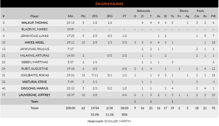 Zalgiris es una montaña rusa. De cinco victorias en los primeros seis partidos, a cinco derrotas en los siguientes encuentros. A pesar de ello, la fábrica de talento lituana sigue su curso habitual. Una de sus últimas joyas es Rokas Jokubaitis, un pibe de veinte años que se achanta ante nada ni nadie. Su talento, exponencial, se queda chico en comparación a su clase para jugar. Es uno de esos bases que desprende elasticidad y dominio del cuerpo a la vez. Que combina calidad y elegancia en pos de un resultado óptimo. Con sus veinte añitos recién cumplidos se animó ante defensores del calibre de Hanga para demostrar que el talento no tiene edad. Junto a él, Lauvergne fue de los mejores de la primera parte. A pesar de las dudas que genera desde hace tiempo su capacidad de dominio en Europa, y aunque seguimos esperando ver la mejor versión de un jugador que generó expectativas de gran envergadura, el francés volvió a evidenciar las carencias en el puesto de pívot del conjunto culé.