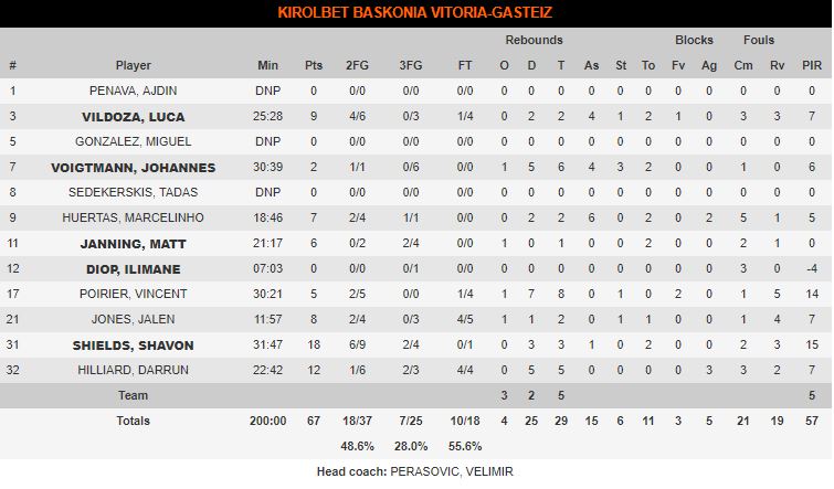 Por el lado de los vascos, Shields fue el único que dio la cara. Por momentos acompañado de Vildoza, pero sin lograr encontrar continuidad ni fluidez en el juego para poder sumar opciones reales de llevarse el partido. Poirier, por su parte, disputó pocos minutos y no estuvo acertado.