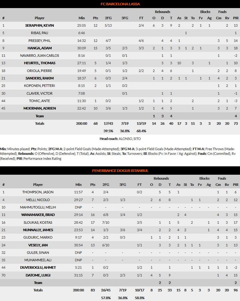 La aparición de Sloukas (17p, 5a) y Melli (7p, 8r) sirvió a Fenerbahce para mejorar en defensa y frenar la aportación blaugrana hasta dejar a los de Sito Alonso en solo 10 puntos anotados en el segundo periodo. Pressey (12p, 4r) y Seraphin (12p, 9r) se quedaban como principales argumentos ofensivos de un FC Barcelona que se apagó desde el perímetro. Con 38-39 se llegaba al descanso.