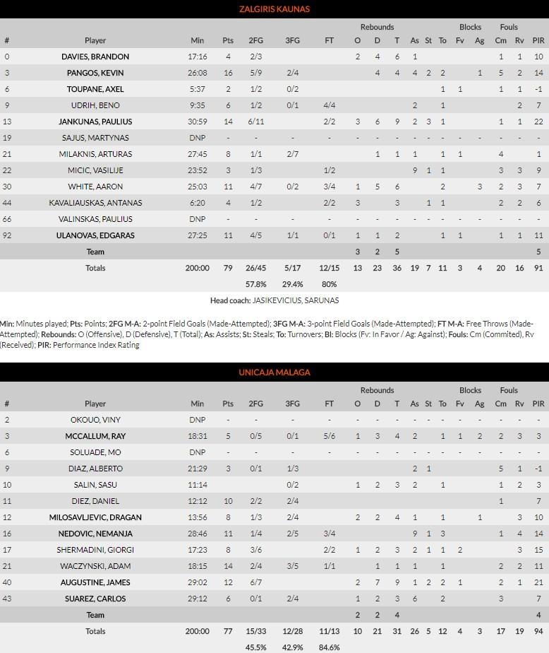 Un tapón de Edgaras Ulanovas sobre una acción de McCallum cerraba el triunfo para Zalgiris en un partido donde Unicaja fue por delante en el marcador durante la mayor parte del encuentro, alcanzando incluso rentas superiores a los 10 tantos poco antes del descanso.