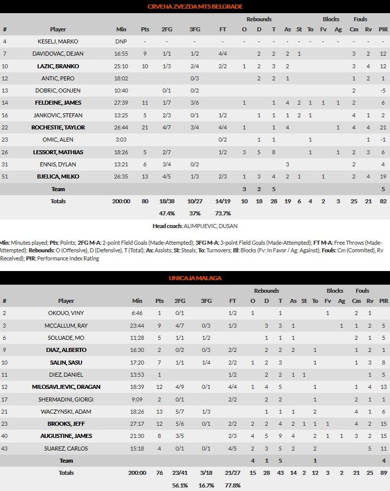 Emergía ya en el segundo periodo la figura de Rochestie para aplacar los intentos de Unicaja de complicar el partido al Estrella Roja. Un parcial 7-0 volteaba el marcador del 30-32 al 37-32. Sería la última ventaja de la que disfrutó en el marcador el conjunto dirigido por Joan Plaza. Al descanso se llegaba con 40-37 y el partido abierto.