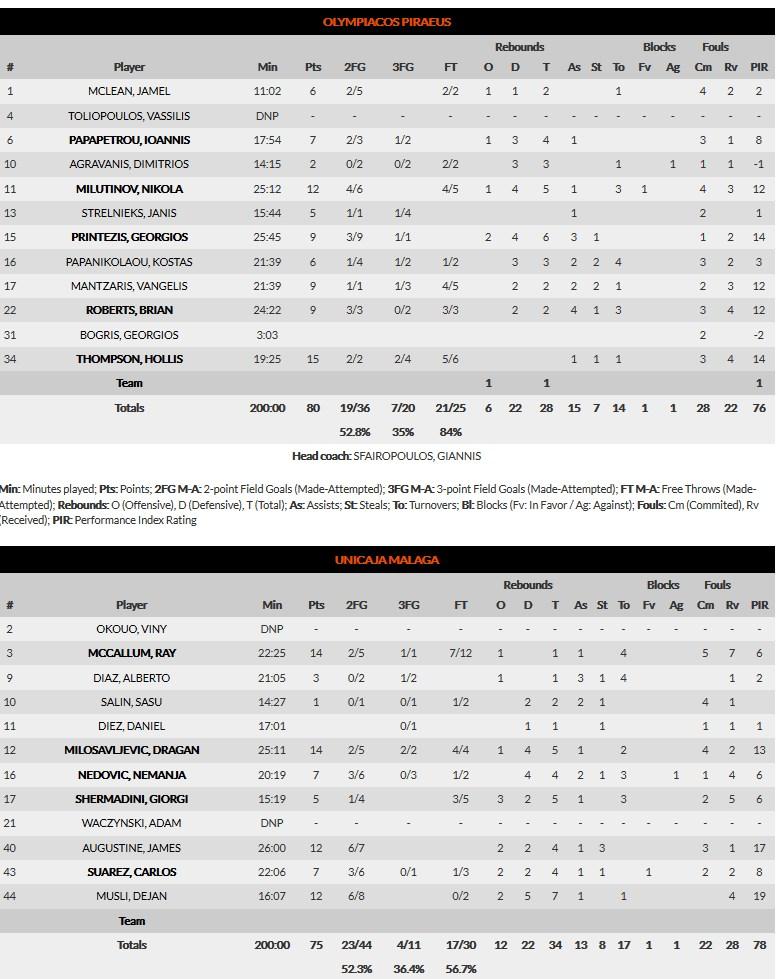 Unicaja Málaga no pudo sacar un triunfo en su visita al Pabellón de la Paz y la Amistad en un partido en el que Olympiacos fue por delante en el marcador desde el comienzo. El arranque local llevó pronto el marcador a rentas relevantes. El acierto exterior de Papapetrou y Thompson llevaba las rentas hasta los quince tantos (19-4). El conjunto dirigido por Joan Plaza se enganchaba al partido reduciendo las rentas en el segundo periodo pero de nuevo Olympiakos abría brecha con el acierto de Strelnieks y Papanikolau. El trabajo en pintura de Musli y Augustine mantenía al conjunto malagueño con vida al descanso (37-33).