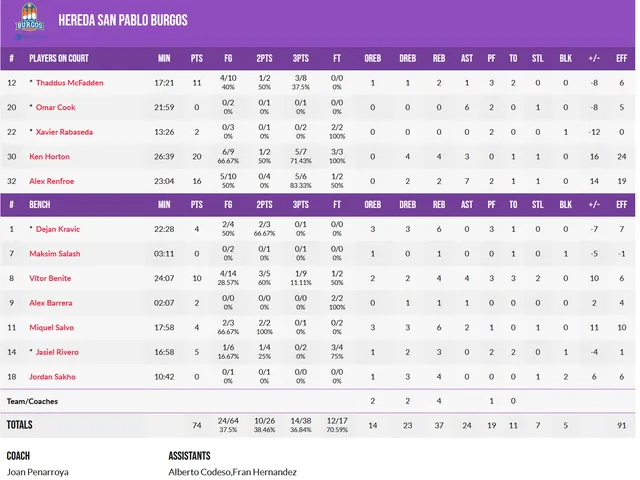 Por parte de los burgaleses, fue Alex Renfroe, con 34, quien cambió el partido. Salió con las pilas cargadas y anotó varios triples en transición para romper la defensa de los turcos, que estaba ganando la partida en la zona, y cambió el ritmo del partido dando una marcha más a los de Joan Peñarroya. En el final del encuentro, fue el director de juego que los azulones necesitaron y supo manejar el ritmo para acabar ganando en un final muy apretado.
