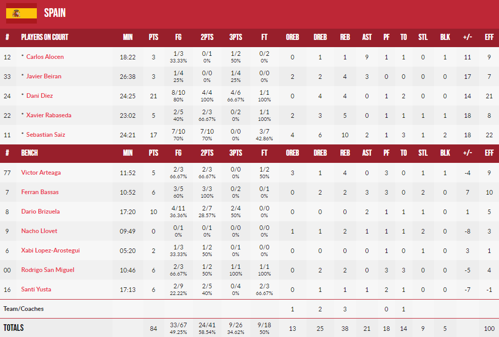 Carlos Alocén, más que un anotador: El movimiento de balón permitió a España conseguir canastas fáciles con las que romper el encuentro desde el inicio. La facilidad con la que Alocén generaba juego entre sus compañeros se vio reflejeado en sus nueve asistencias, acabando como máximo asistente del partido. Además de su contribución desde el pase, el base maño consiguió tres puntos, un rebote y un robo de balón.