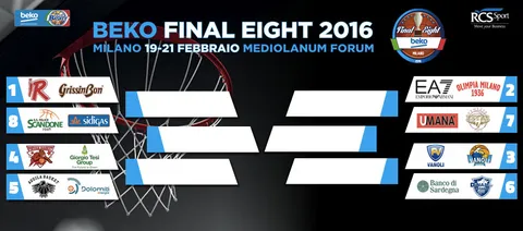 Se han definido los emparejamientos para la Beko Final Eight 2016 que se disputará del 19 al 21 de febrero en Milán. Se clasifican los ocho primeros de la primera vuelta y el formato es prácticamente idéntico al de la Copa del Rey española. El primero juega contra el octavo, el segundo ante el séptimo, el tercero contra el sexto y el cuarto contra el quinto. Así, los duelos han quedado fijados según los puestos que han obtenido cuando ya se ha disputado la primera vuelta de la competición. Sassari lo tendrá difícil para revalidar el título del año pasado, pero Logan (MVP de este título la temporada anterior) pondrá de su parte para que así sea. Brindisi, semifinalista el año pasado, se ha quedado fuera tras su derrota ante Cremona, en beneficio de Avellino, que cosechó un triunfo importante ayer ante Venezia. Por tanto, el cuadro queda de esta manera: