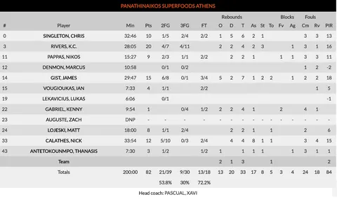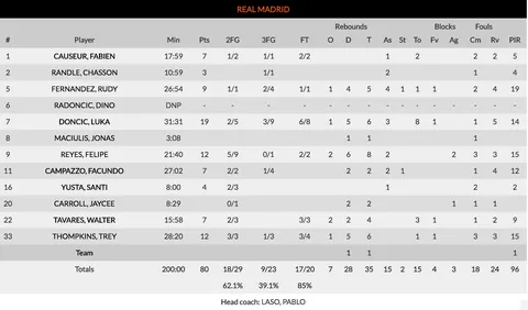1. Primera parte inmaculada del Real Madrid. Los blancos salieron con un quinteto muy novedoso, con Yusta de titular, jugando de falso 4 y compartiendo posición con Doncic. La espectacular puesta en escena de Matt Lojeski (8 puntos sin fallo) permitía a los suyos endosar un primer parcial de 8-2, pero el Real Madrid se apoyaba en el poderío de Tavares en la zona y la respuesta de Yusta a la titularidad para dar la vuelta al marcador y poner el 11-12 en el minuto 6 de partido. Una ventaja que duraría hasta el minuto 37 de partido. Los de Laso se hacían con el ritmo del encuentro y con una selección de tiro excelente, lograban colocarse en la decena apenas 10 minutos después de verse por debajo (27-37, min. 13). El buen hacer de Doncic en los tiros (10 puntos en la primera mitad) contrastaba, sin embargo, con las malas decisiones en la dirección (5 pérdidas, 8 al final del partido). Pese a ello, el Real Madrid seguía aumentando la distancia con un gran juego coral (excelentes Thompkins, Reyes y Tavares, como únicos recursos interiores) y se marchaba al descanso con un contundente 40-54 que hacía olvidar la mermada rotación con la que había viajado a Atenas. La carta de tiro al descanso, espectacular: 13/17 en tiros de dos, 6/11 en triples y 10/10 en tiros libres.