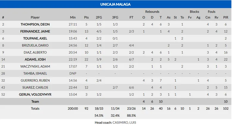 MVP tripartito: Si hablamos de estadísticas, Josh Adams ha sido el mejor jugador del partido, y sobre todo el Unicaja. Sin embargo, la anotación de la dupla Alberto Díaz-Darío Brizuela fue clave. También cabe destacar a Carlos Suárez, que sigue en estado gloria tanto en ataque como en defensa.