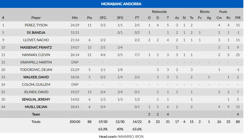 Siempre por delante, pero nunca cerró el partido: Esta frase traduce lo que ha sido el partido del Morabanc Andorra. Los locales fueron la mayor parte del partido por delante, pero nunca llegaron a cerrar el partido. Clevin Hannah ,saliendo desde el banquillo, fue el mejor de los del Principado.