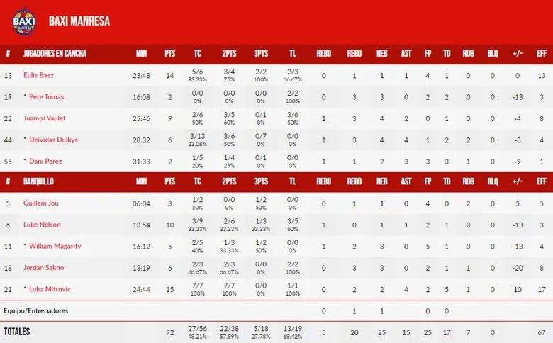 Los fallos en el triple, letales para Manresa: En un partido clave para las aspiraciones del conjunto manresano en la Basketball Champions League, el acierto desde la línea de tres puntos volvío a ser la gran cuenta pendiente. Tan solo 6 triples de 23 lanzados fueron convertidos por parte del equipo catalán. Destacó Pere Tomàs, máximo triplista de los suyos, anotando 2 de los 3 intentados por su parte para acabar con 9 puntos. El encuentro se decidió con un triple errado de Manresa, lo que reflejó el estrago que este apartado supuso para ellos.