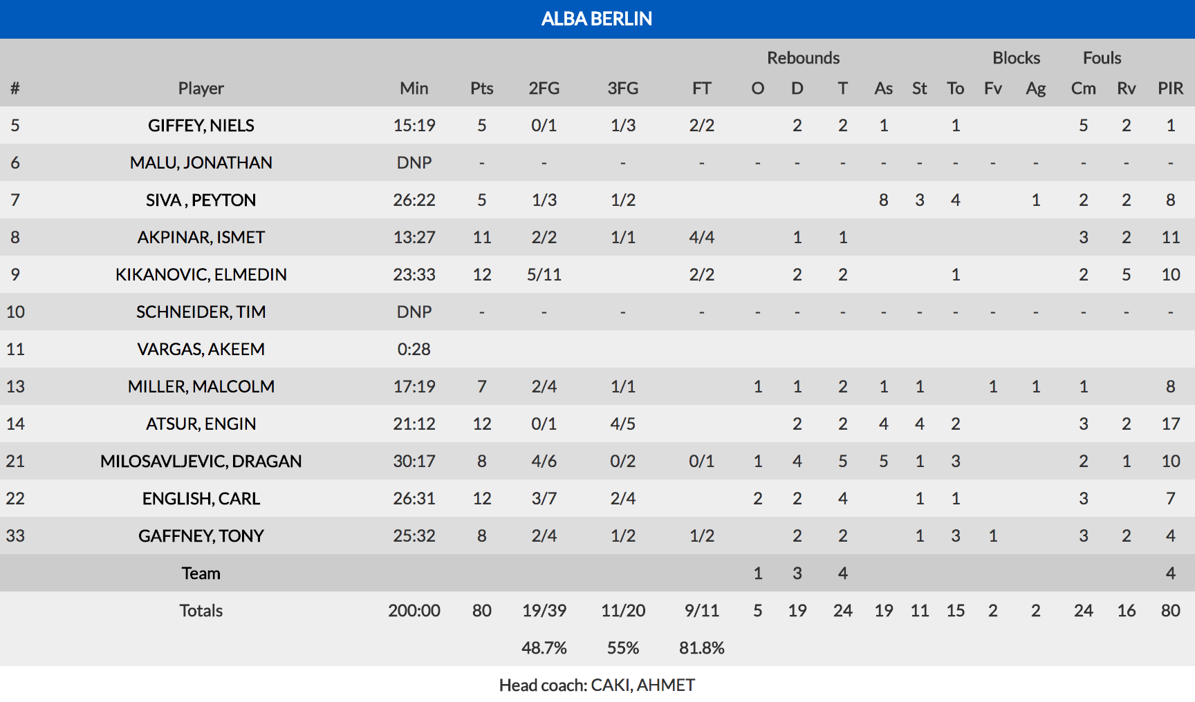2. Cortocircuito taronja: El Alba de Berlín vio que estaba haciendo mucho daño con la presión a toda pista al base y mantuvo el esquema durante el segundo periodo. El base Akpinar secó tanto a Diot como a Vives y Engin Atsur con un triple puso por primera vez en el partido por delante al conjunto alemán 26-27. Una vez por delante el equipo de Caki siguió anotando con facilidad hasta conseguir un parcial de 4-15 (28-35). Fue en ese momento cuando tirando de orgullo Rafa Martínez y Fernando San Emeterio tomaron el control del partido, el catalán logró un triple más tiro libre adicional para acercar a los taronja aunque fallaría el adicional y San Emeterio con 11 puntos le dio la vuelta de nuevo al marcador poniendo al equipo dirigido por Pedro Martínez tres puntos arriba al descanso 46-43. El Valencia Basket solo cometería cinco faltas en la primera parte, la parte negativa es que de las cinco, tres caerían sobre el pívot catalán Pierre Oriola que vería sus minutos lastrados y obligaría a Pedro Martínez a forzar a Kravtsov que regresaba de una lesión.